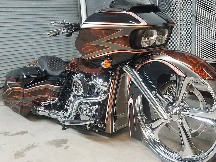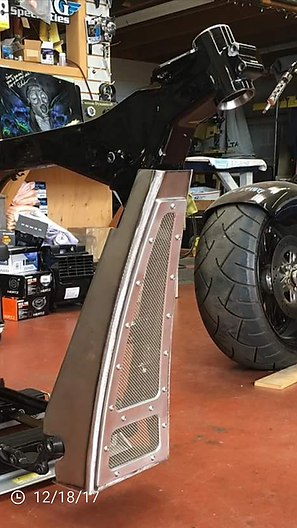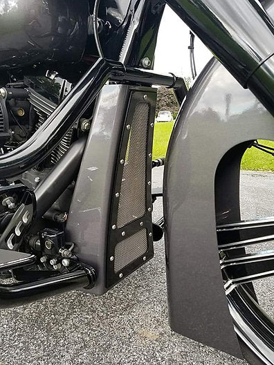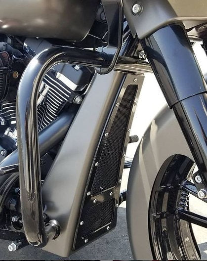 These hand fabricated chin spoilers are made from 18 ga cold roll steel and are designed as a bolt on spoiler. They include all mounting tabs and hardware. Also included with our Spoilers is a fully CnC machined 6061T6 Billet aluminum bezel inlaid with polished stainless steel mesh. These spoilers are only sold in raw form. We offer these spoilers in two lengths. Tall which is for those not running a crash bars and short for standard crash bar equipped models.
