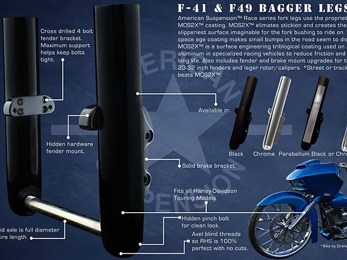 American Suspension Race series fork legs use the proprietery MOS2X coating. MOS2X elimates stickion and creates the slipperiest surface imaginable for the fork bushing to ride on. This space age coating makes small bumps in the road seem to disappear. MOS2X is a surface engineering tribological coating used on Aircraft aluminum in specialized racing vehicles to reduce friction and insure long life. Also includees fender and brake mounts. *Street or track, noting beats MOS2X.