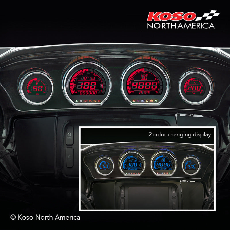 Following the positive reviews we received from Harley enthusiasts, we decided to release the updated Baggers meter kit for touring models 2014 to 2020. This plug & play kit from Koso is now available to replace the stock meters without any hassle ! There is no need to drill holes or to rewire the meters, they will fit directly in the OEM dash and connectors. This kit features a dual color changeable LCD display (red or blue) for a custom look to fit your motorcycle. The HD‑03 kit includes a multifunction speedometer, tachometer, volt meter, and a fuel level meter. If you’re looking to enhance the look of your Harley, Koso has the plug & play solution for you !
