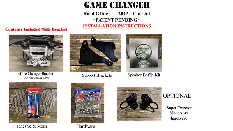 Contents Included in Kit: Game Changer Bracket – Support Brackets – Speaker Baffle Kit – Loctite & Mesh – Hardware – Installation Instructions