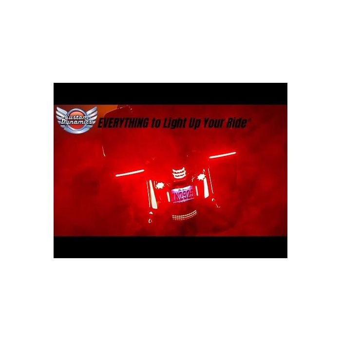 The perfect solution to add stylish visibility to the back of your Street Glide or Road Glide. 45 super bright dual intensity red LEDs on each side illuminate to function as additional Running & Brake lights. Completely sealed behind a red or smoked lens with a decorative chrome or gloss black trim. Units adhere to each side of the rear fender fascia with double sided tape and include a plug and play wire harness for a simple install. The design of the Fascia LED Panels compliments the ProBEAM® LED TriBar 1 perfectly! Custom Dynamics® SMART Triple Play® required for Run/Brake/Turn function (sold separately). Lifetime LED warranty.
