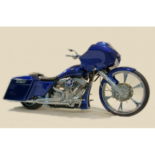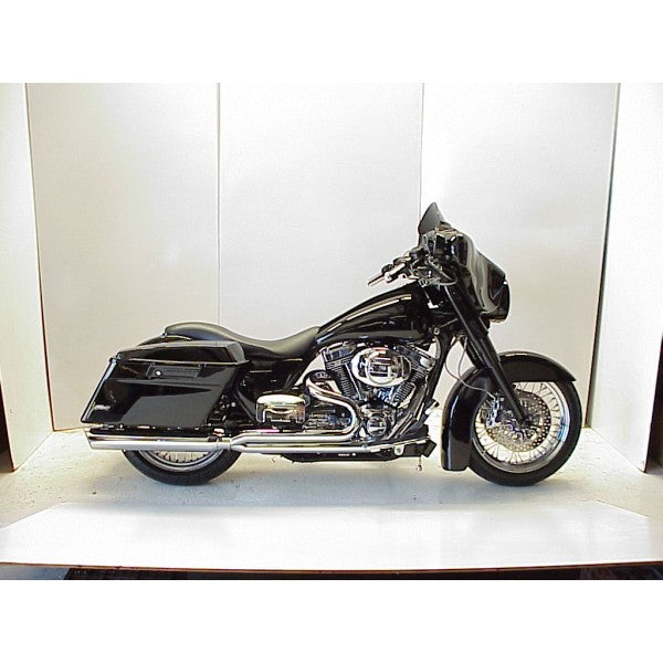 - The length of the system with the muffler is too short to use with Extended bag. We offer extended length muffler for bikes that have stretch bags. We will send a special order form to fill out. There is a upcharge of $250.00 per muffler. Call Sales office 817-834-8961