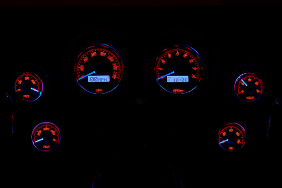 Dakota Digital is proud to introduce the MVX Series Analog Bagger Gauges! With 2 bezel options, 4 background choices and 7 lighting colors to choose from, the combinations are nearly endless. Personalize your setup by programming the Pointer, Backlight, and LCD Message Center colors independently. Whether you start with a 2-gauge set and build your favorite options or choose the 6 gauge pre-configured setup, you can display 7-gauge readings in the LCD Message Centers in the Speedometer and Tachometer (Speed, RPM, Volts, Fuel, Oil Pressure, Oil Temp, and Air Temp), as well as Miles to Empty and performance readouts(0-60 speed and time as well as ¼ mile speed and time).