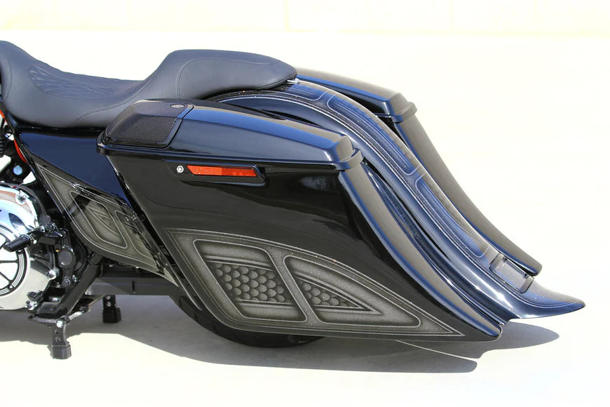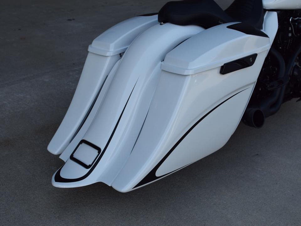 Sweep death 5.75″ longer bags, Sweep is 10’’ longer out the back, bags will come carpeted and primed. Kit includes: Bags, Fender. This kit was made for the 26’’ and 30’’ bagger guys. All parts are vacuum infused with a high end resin and oven cured for 4 hours All parts will need to be sanded smooth before painting, no other prep before painting Lights and Harness not included in the price Air ride would be recommended for this kit.
