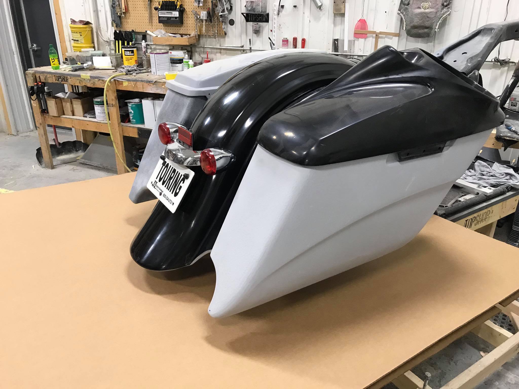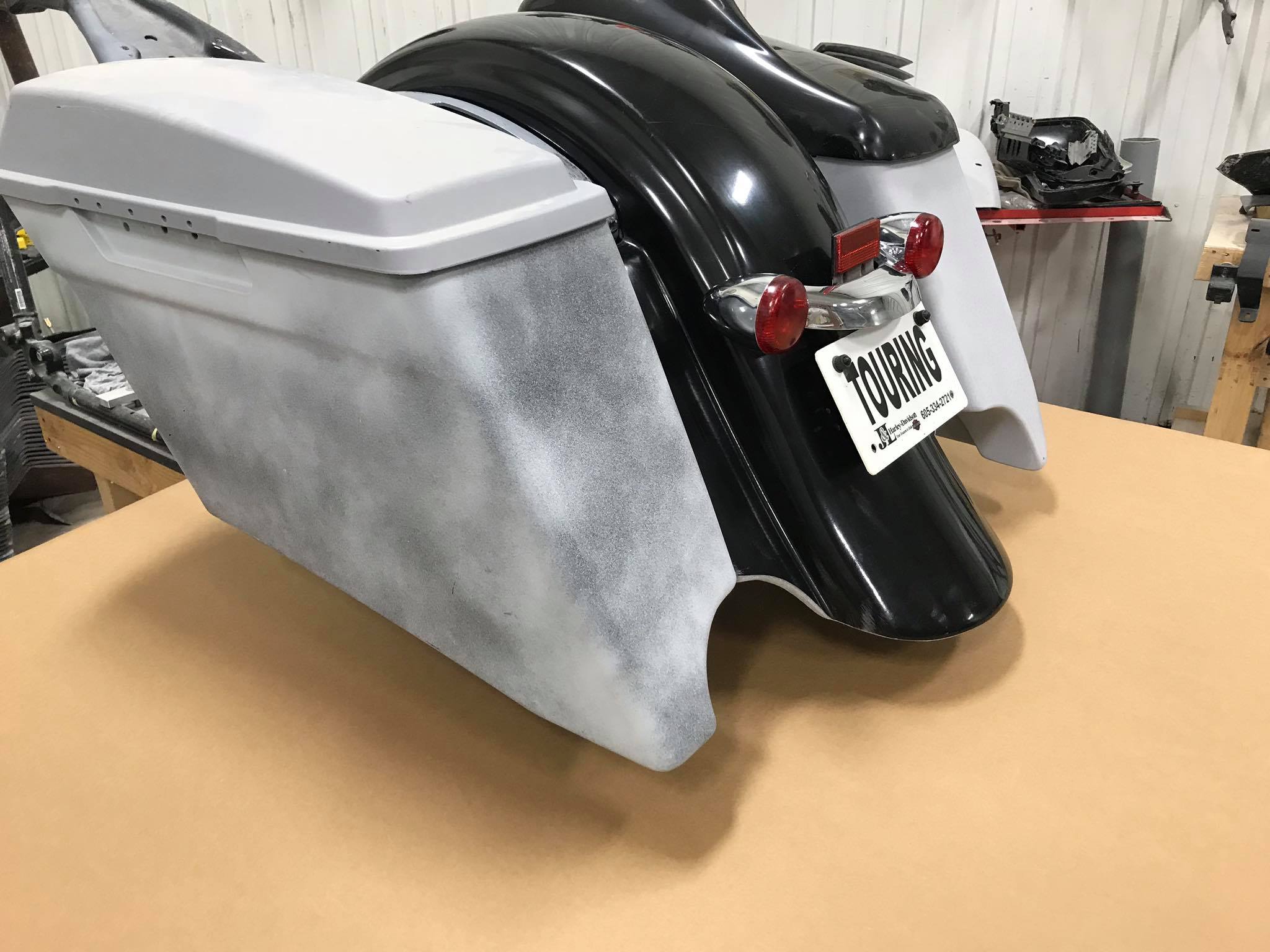 2009-2019 Harley touring ( new money kit)! This kit is our entry level package kit! Comes with our 322 bags, our brand new (new money) rear replacement fender that uses your stock light bar and plate frame, comes with our new pop on side covers! Bags are carpeted everything is primed and our parts are built in house 100% USA you can get these bags in duals, right side and no exhaust cutouts! This new money fender does fit stock and stretched harley bags nicely