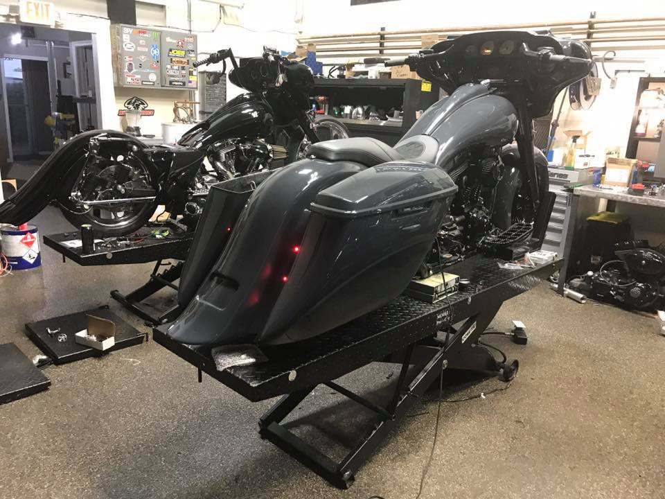 5.5″ Stretch, 7.5″ Sweep kit includes the Bags, Fender, Side Cover, Plate Frame All Bags come primed and carpeted All parts are vacuum infused with a high end resin, oven cured at high temp These bags are made to ride, All parts will need to be sanded smooth before painting, no other prep before painting This kit you would not need Air ride. this kits has 3 options for exhaust Dual, Right & No Exhaust. Please allow 2-3 weeks when your order is placed, all of our products are made by hand. This kit will fit on 09-13 bike, the only thing you will have to do is change your lids to the 14 style lids. if putting exhaust on your bike it must have stock Harley head pipes, can’t have Long shocks only Harley shocks.