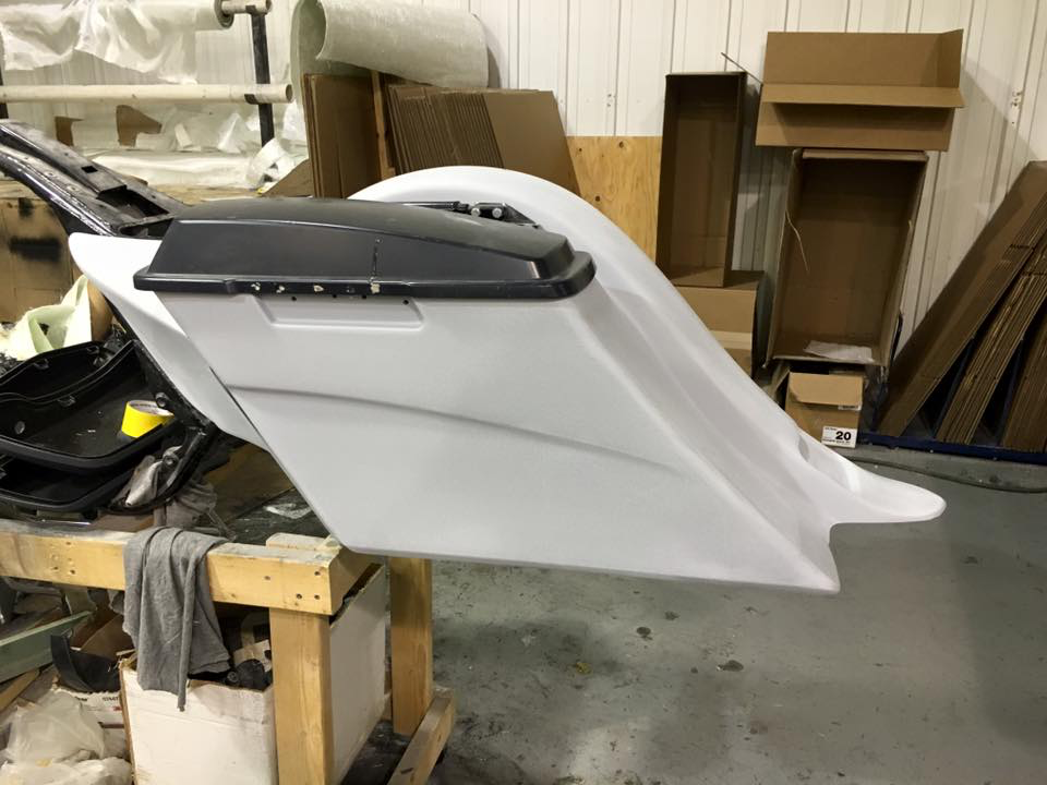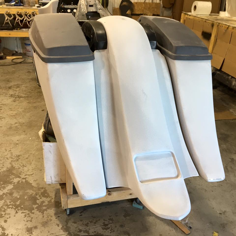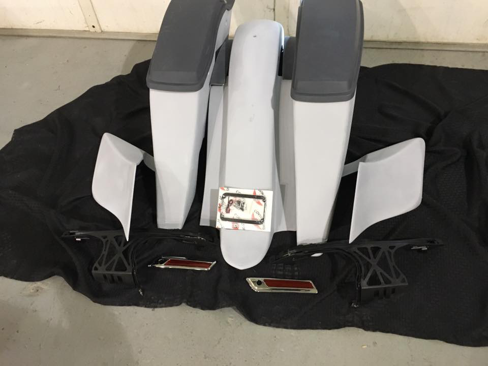 6″ down and 12″ back kit includes 14-16 bags, fender,14-16 side covers, plate frame, 14-16 OEM style lids and hardware, strut covers this kit would require air ride Exhaust options would be side exhaust or a 90 degree turn down bags are carpeted, with 2 coats of primer, only thing to finish before paint is wet sand bags and fender are pre drilled, you can use your existing hardware on the bags and fender.